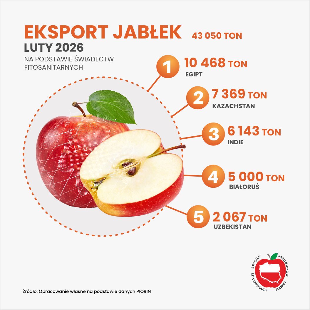 Luty był rekordowym miesiącem pod względem eksportu polskich jabłek w porównaniu do ostatnich dwóch miesięcy. Dane PIORiN wykazują, że wyeksportowaliśmy 43 050 ton jabłek do 31 krajów poza Unię Europejską. Dla porównania, w styczniu było to 34 503 ton, a w grudniu 41 737 ton.