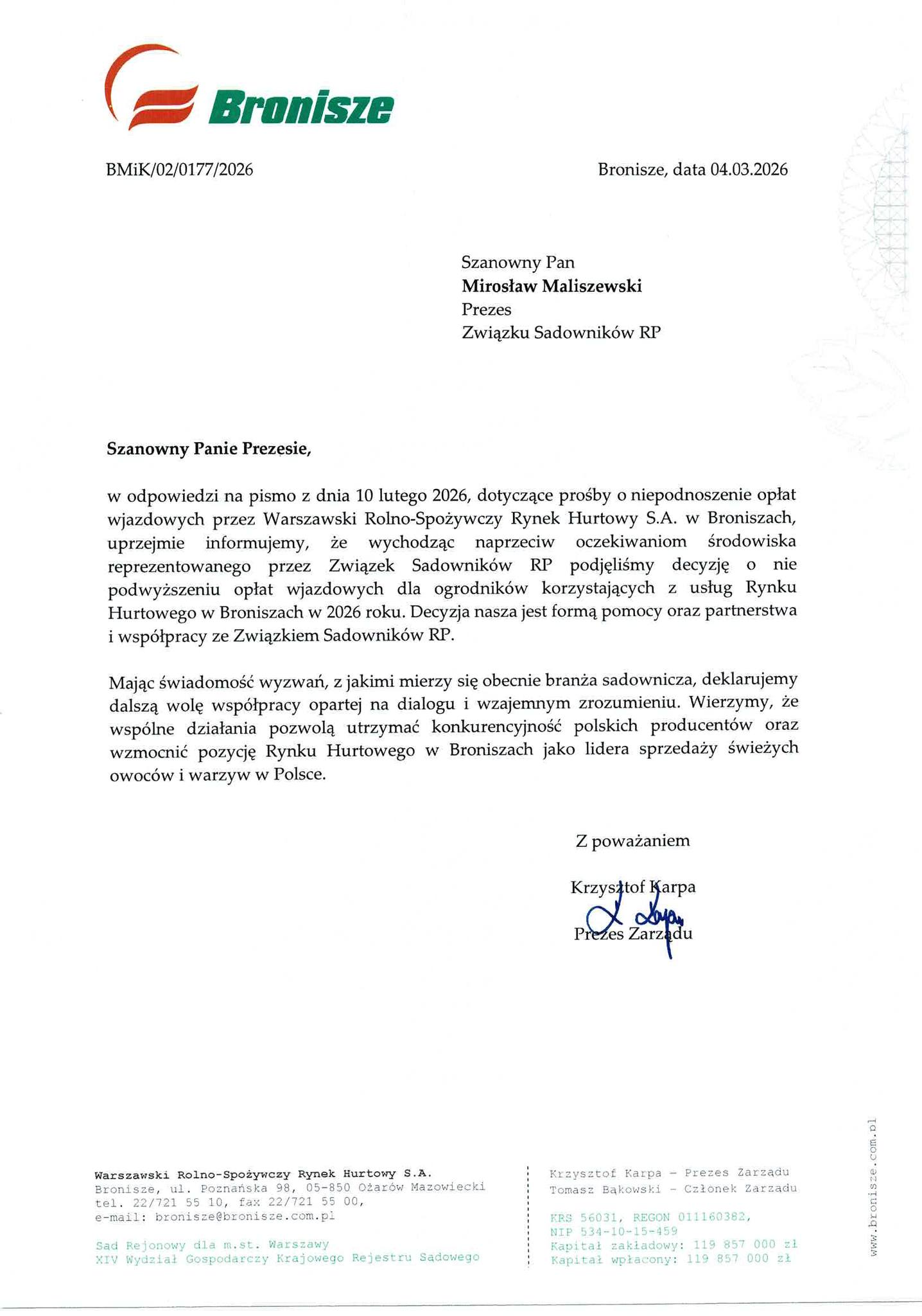 Mając na uwadze niestabilną sytuację polskich sadowników, skierowaliśmy do Prezesa Warszawskiego Rolno-Spożywczego Rynku Hurtowego BRONISZE pismo z prośbą o niepodnoszenie opłat wjazdowych w 2026 r. o wskaźnik inflacji.