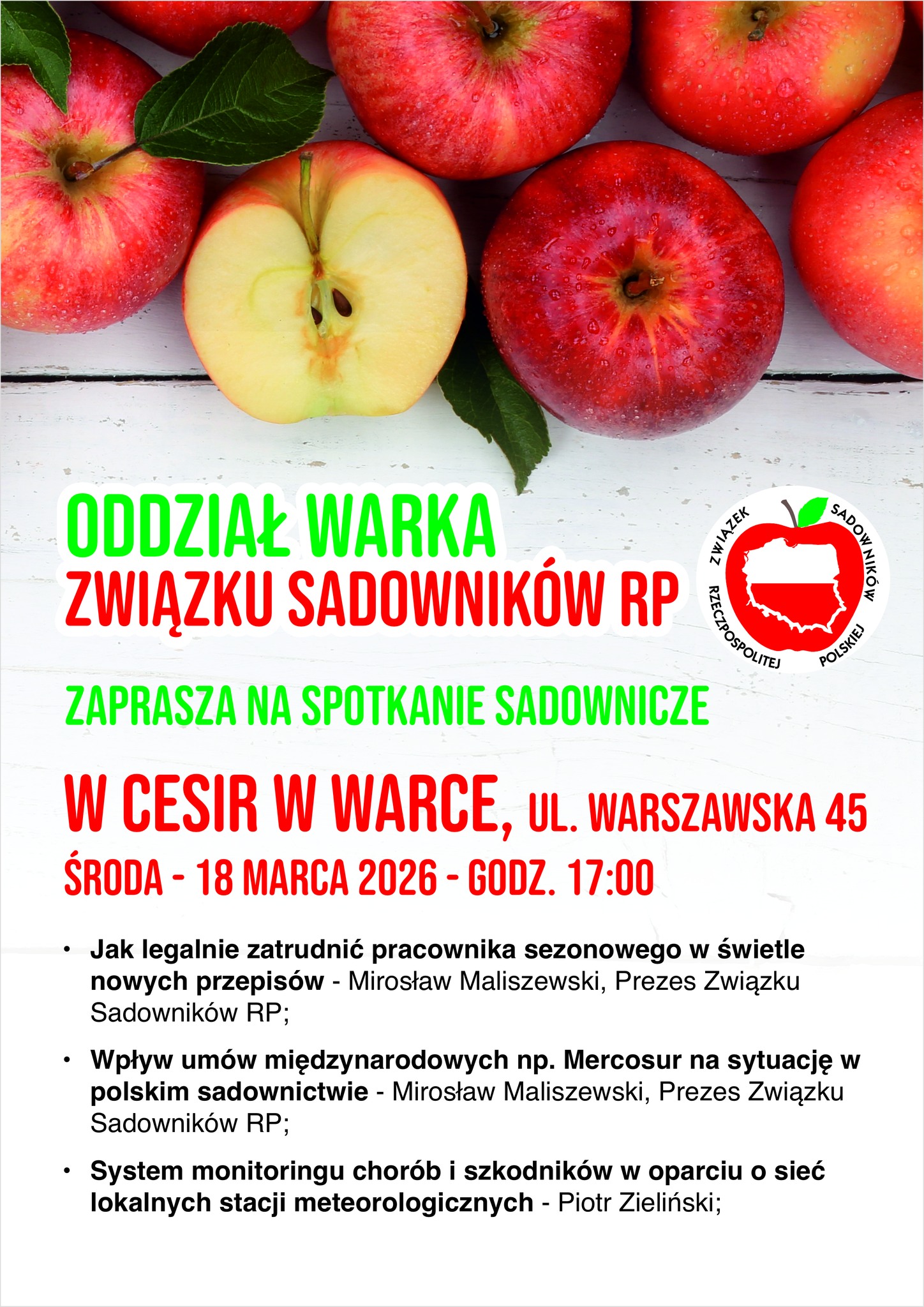 Związek Sadowników RP, Oddział Warka, zaprasza na spotkanie sadownicze poświęcone aktualnym tematom ważnym dla branży.
