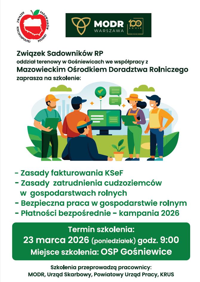 Związek Sadowników Rzeczpospolitej Polskiej, oddział terenowy w Jasieńcu, we współpracy z Mazowieckim Ośrodkiem Doradztwa Rolniczego, zaprasza na szkolenie poświęcone aktualnym zagadnieniom ważnym dla gospodarstw rolnych.